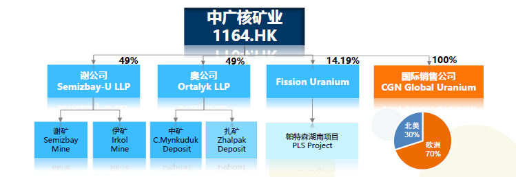 中廣核礦業(yè)的主要業(yè)務(wù)是核能企業(yè)使用的天然鈾資源的開(kāi)發(fā)與貿(mào)易。公司目前持有資產(chǎn)包括: 1.哈薩克斯坦謝米茲拜伊鈾公司49%的權(quán)益和產(chǎn)品包銷(xiāo)權(quán)。 2.哈薩克斯坦奧爾塔雷克公司49%的權(quán)益和產(chǎn)品包銷(xiāo)權(quán)。 3.加拿大鈾礦勘探公司FissionUraniumCorp.14.19%的股權(quán),和20%的天然鈾產(chǎn)品包銷(xiāo)權(quán)以及額外15%的包銷(xiāo)選擇權(quán)。 3.中廣核國(guó)際鈾產(chǎn)品銷(xiāo)售有限公司100%的股權(quán)。
